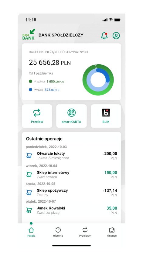 Podgląd salda, historia operacji, filtrowanie transakcji, notyfikacje push -
